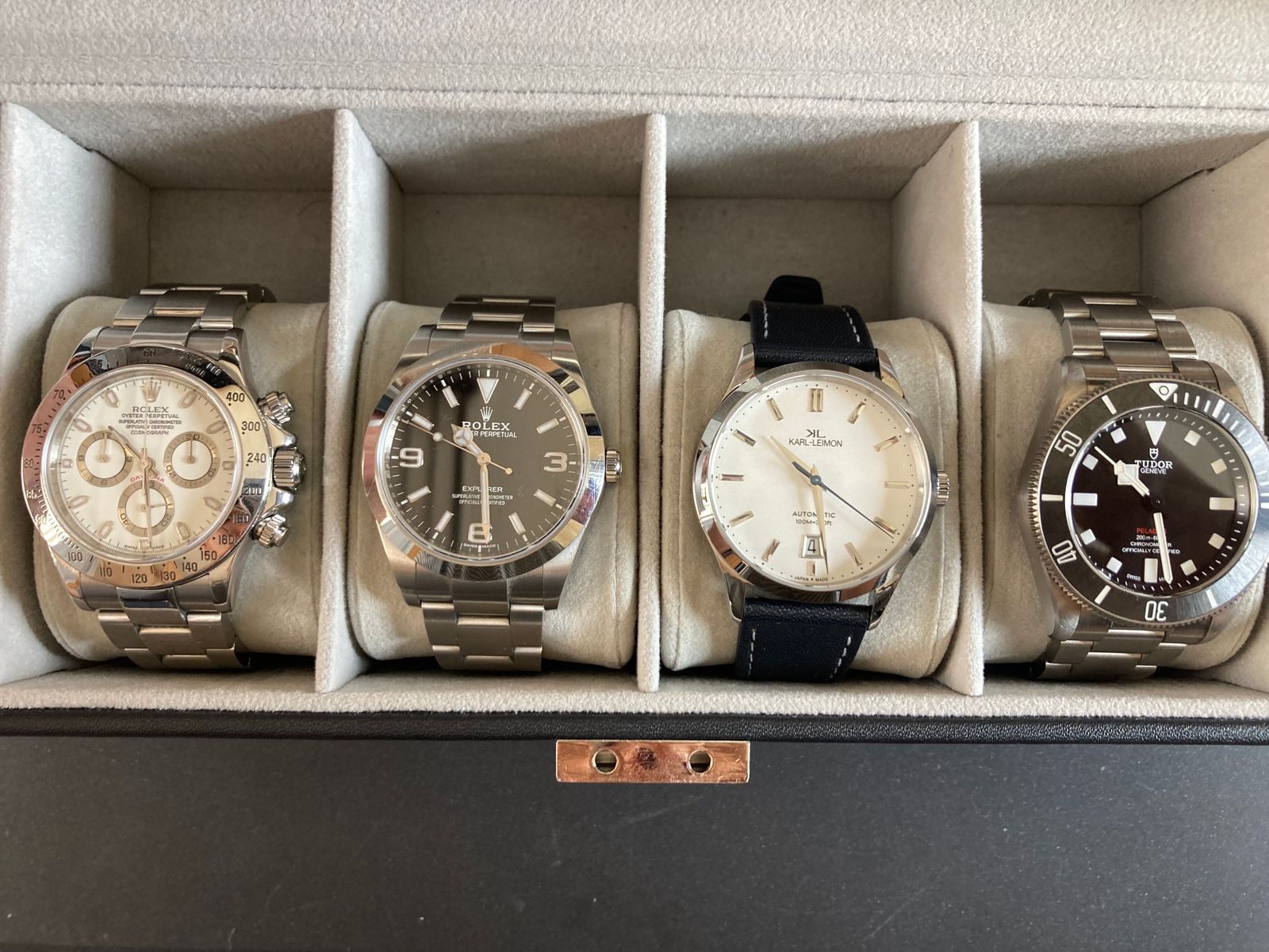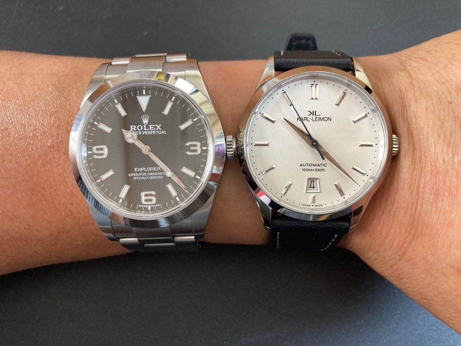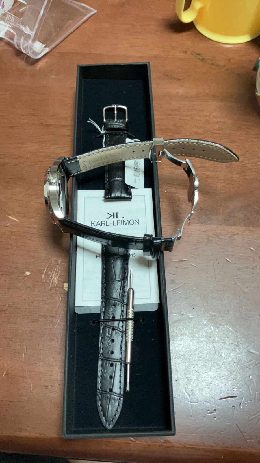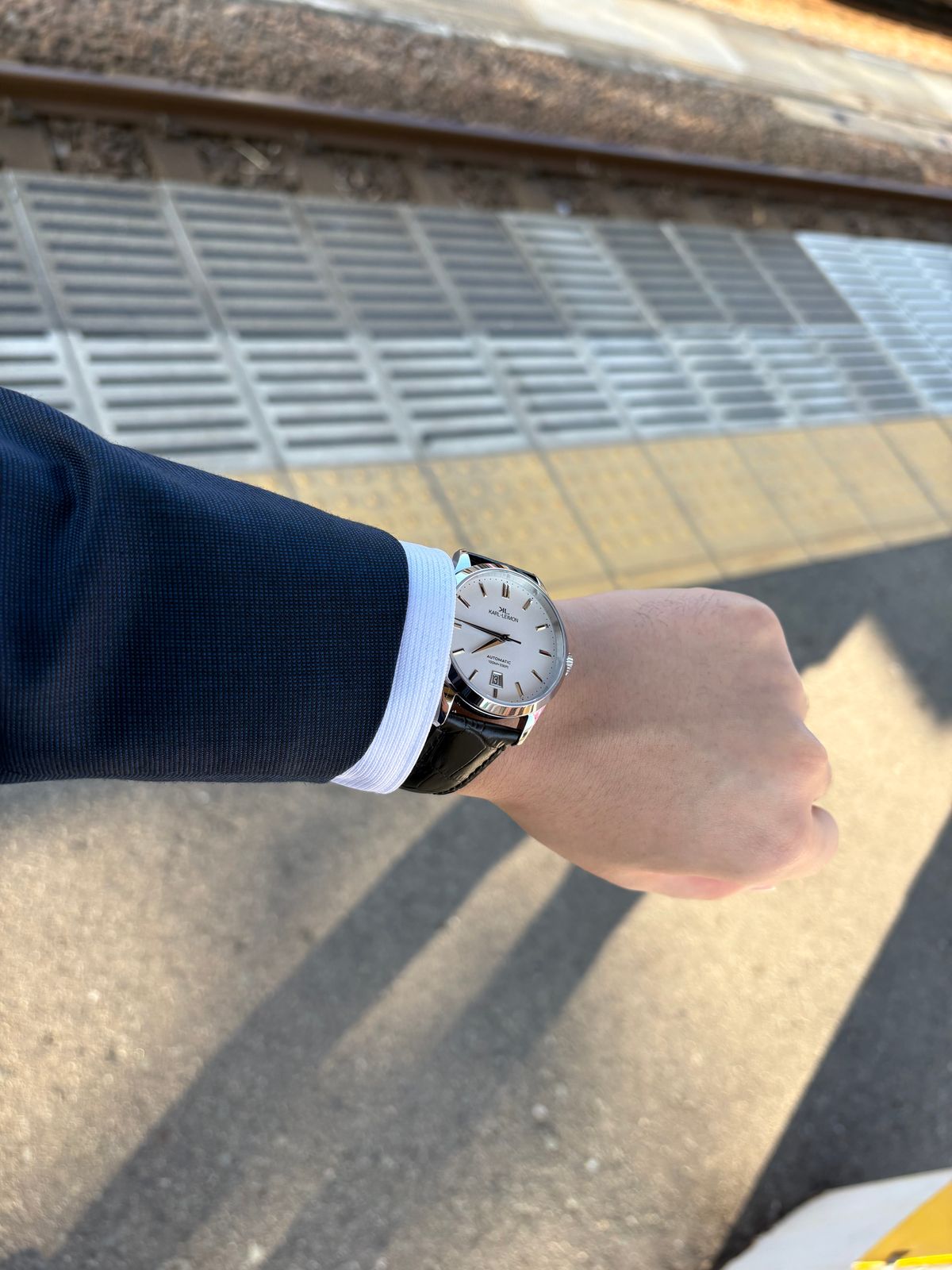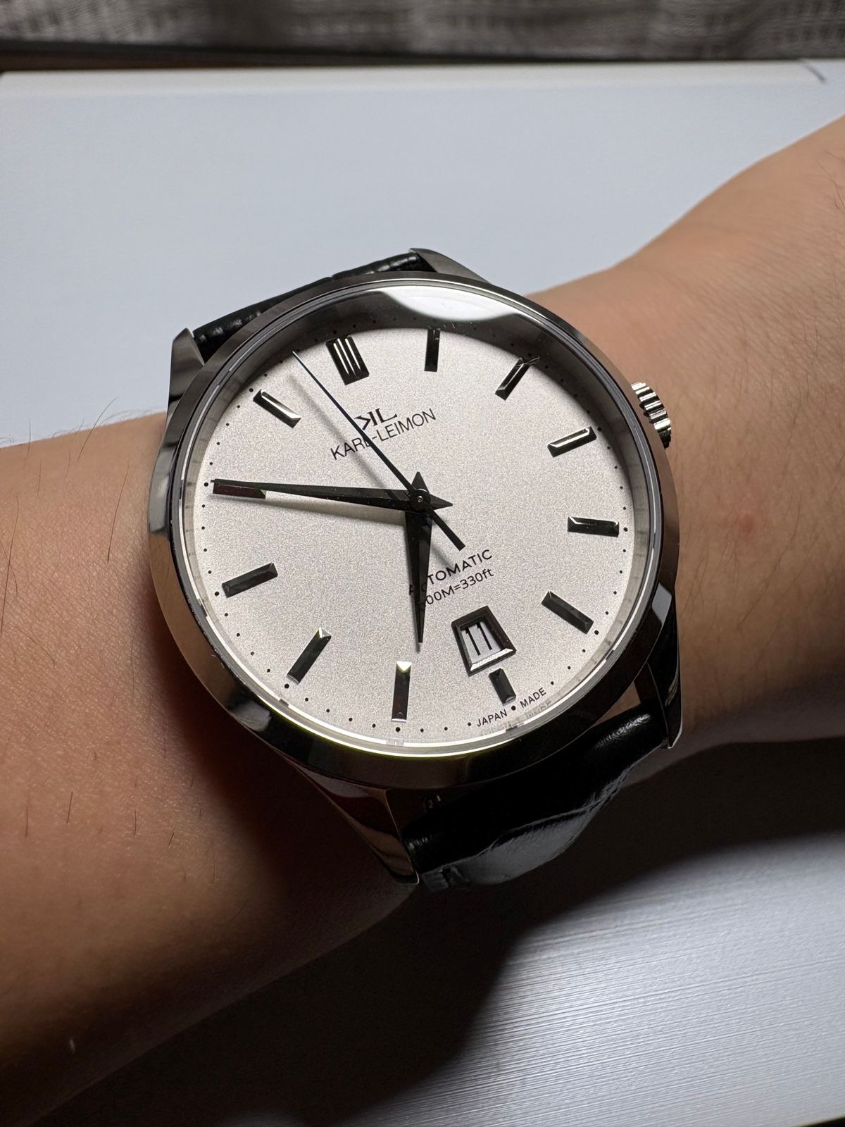 仕事上時計を目立たせたくない時、冠婚葬祭でも着けられるそんな一本をネットで探す日々でした。毎日着ける一本ではないので価格は抑えたい、が満足のいく一本でもありたい。そんななかで巡り合えたのがカルレイモンでした。コレクションに並べても遜色ない満足のいく一本となりました。腕まわりは16.5mmです。